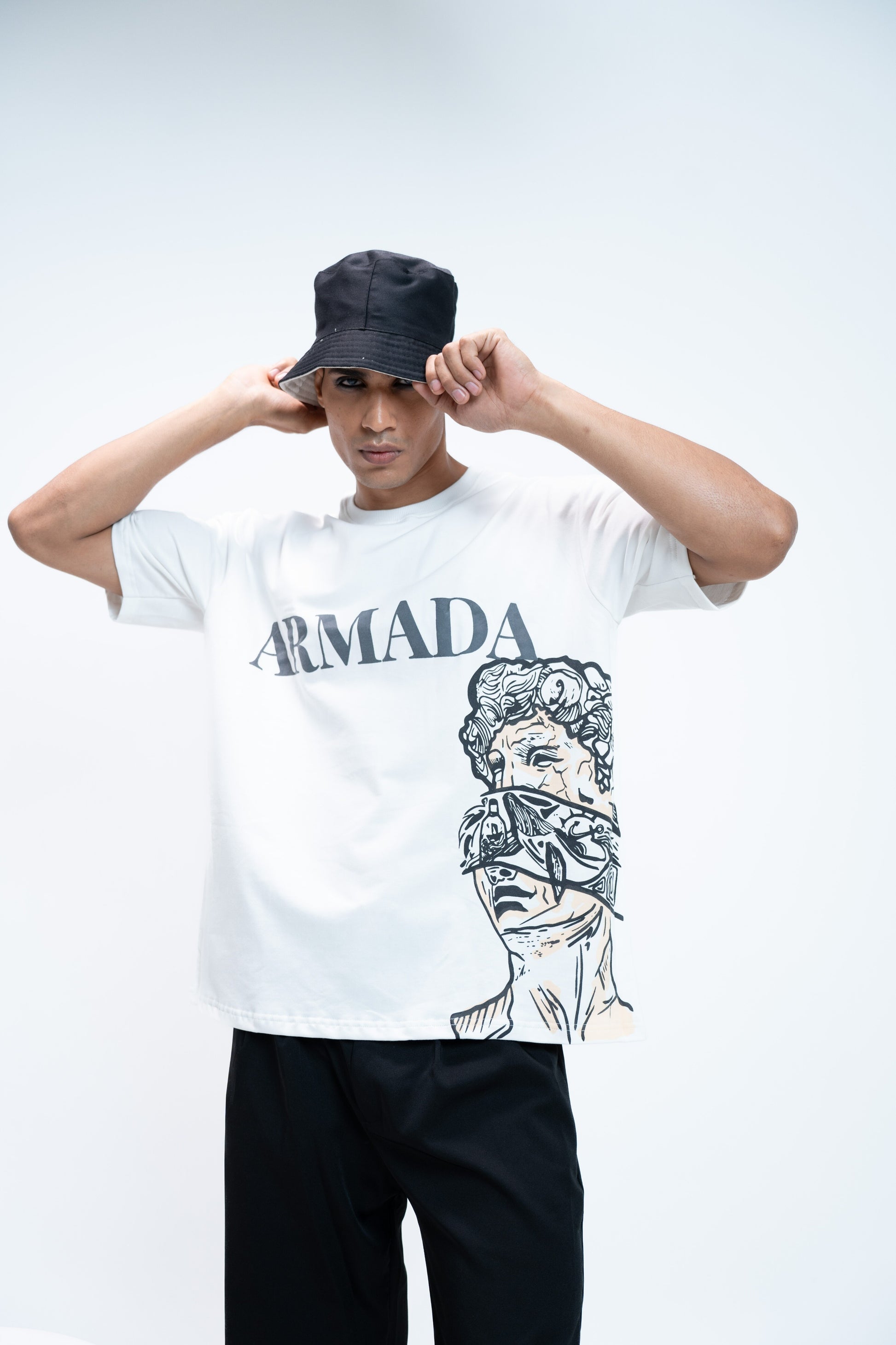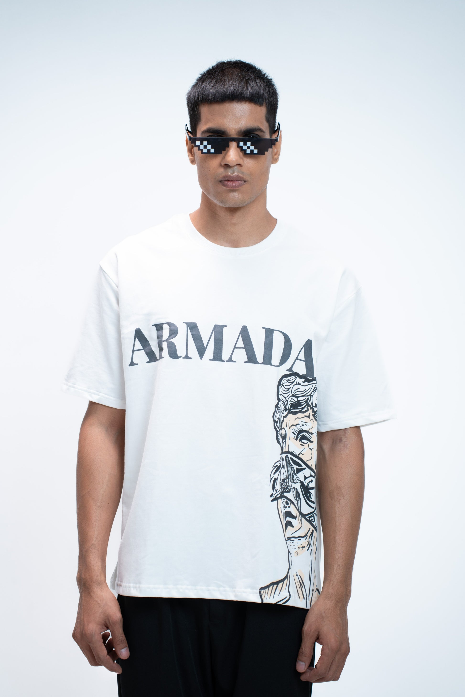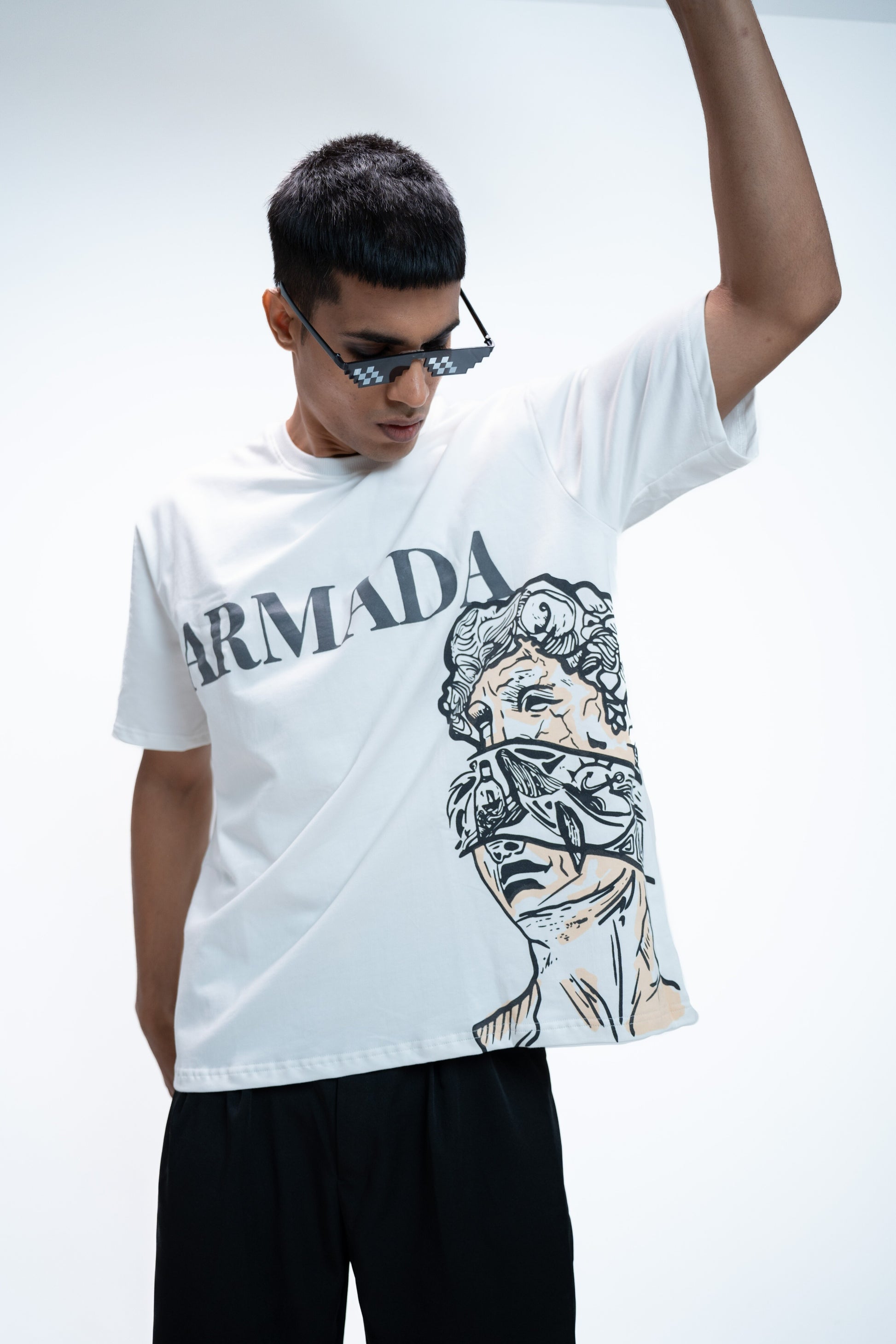 Blind Glory reimages classical art through street rebellion. It is a part of ARMADA's first ever drop. This tee features a fragmented, blindfolded Greek figure on the front - silenced by striking. The bold ARMADA rises above the textured puff print on the chest demanding attention.